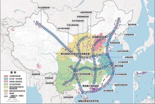 其次,红色椭圆圈定的城市群梯次布局。19个城市群如同附着在“骨骼”上的“肌体”与“器官”,梯次层级推进,承担不同使命。
