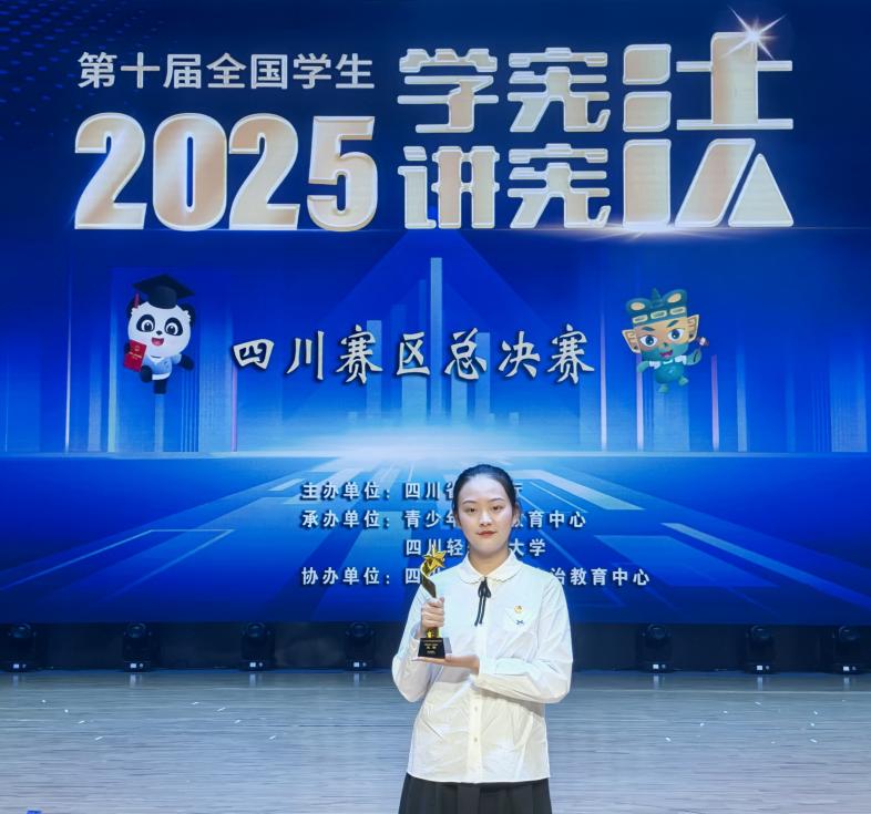 决赛分为主题演讲与即兴演讲两个环节,吴清淼同学在主题演讲中创新性地以绵竹特色非遗文化——绵竹年画为载体,巧妙融合法治精神,从传统文化中的公序良俗延伸到当代法治实践,让抽象的法治条文变得鲜活可感,首轮排名第五。在即兴演讲环节,她凭借扎实的知识储备和出色的临场发挥,以清晰的逻辑和鲜明的观点赢得评委一致好评,获得该环节最高分,实现完美逆袭,跃居亚军。