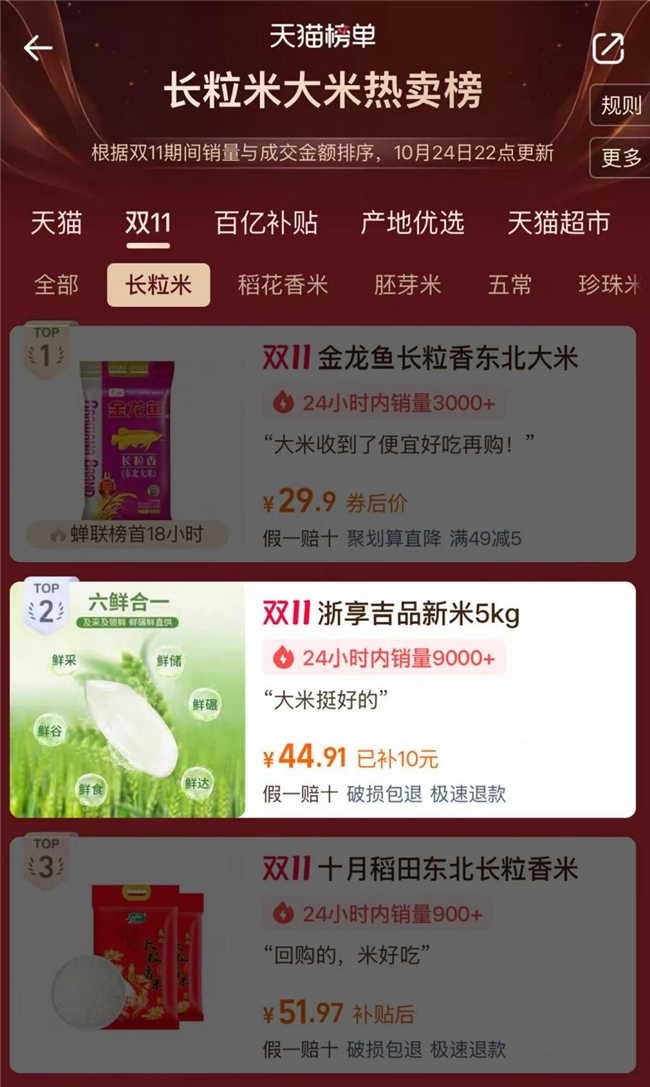 24日零点一过,“吉林鲜米”在百亿补贴官方直播间上线仅2分钟即达成超2000单成交,当天23小时内累计销售大米60吨,销量位列天猫长粒米畅销榜总榜第二名。这一系列数据不仅印证了消费者对产品本身的高度认可,更凸显了百亿补贴作为“品牌放大器”与“市场催化剂”的平台价值。通过与百亿补贴的合作,吉林鲜米迅速跨越地域限制,精准触达对品质生活有高要求的消费群体,实现“产地特产”到“全国名品”的认知升级。