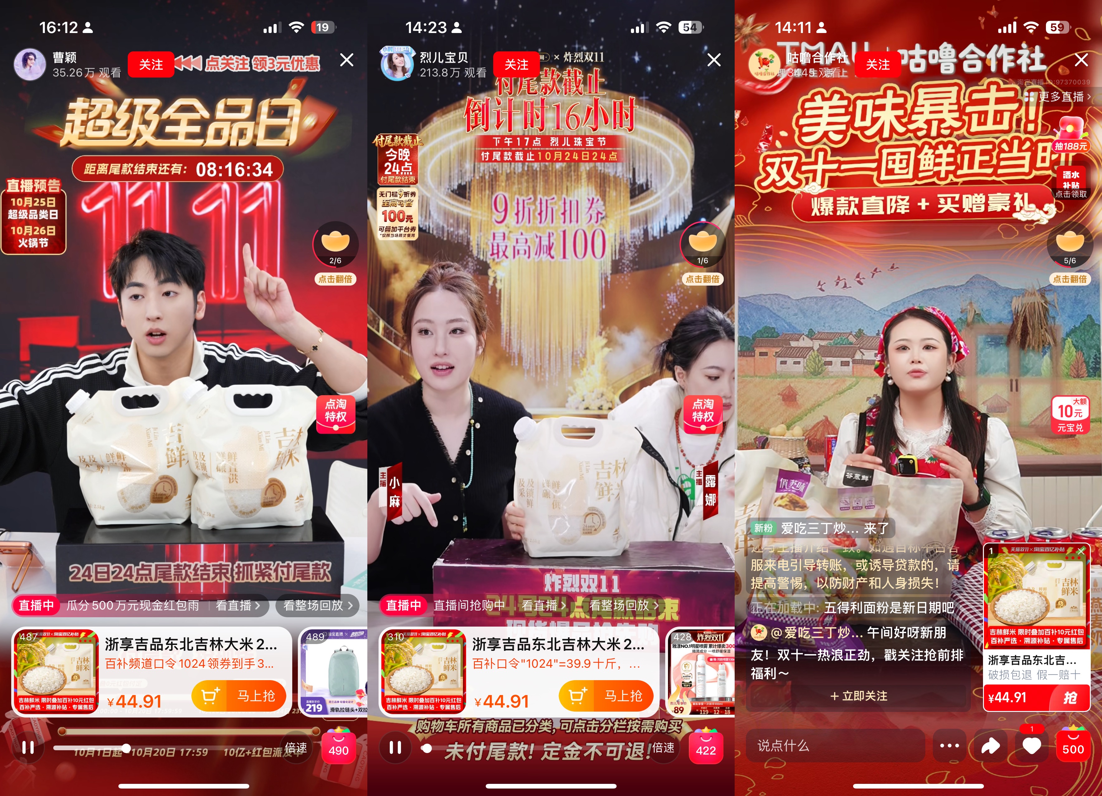 近日(10月24日),“吉林鲜米”携手淘宝平台“百亿补贴”官方直播间,创下23小时销售超12000单、天猫行业大米类目销量第一名、淘宝直播大米类目成交第一名、天猫长粒米畅销榜总榜第二名的亮眼成绩,全网曝光量突破千万次。此次合作不仅是销售数字的突破,更标志着吉林鲜米在百亿补贴的助力下,实现了从“产地优品”到“品牌好物”的价值跃迁,为吉林优质农产品深入长三角、走向全国市场开辟了全新的数字化通路。