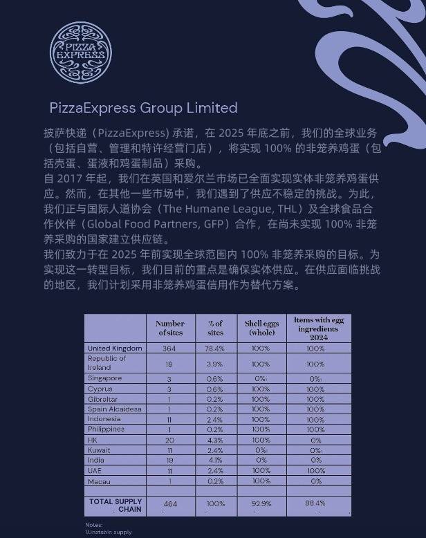 披萨快递(PizzaExpress)在亚洲及全球范围内均有业务布局。该企业近日分享了向100%非笼养鸡蛋采购目标迈进的最新进展,并宣布将在本地非笼养鸡蛋供应不足的地区,通过非笼养信用采购的方式继续推进承诺的落实。