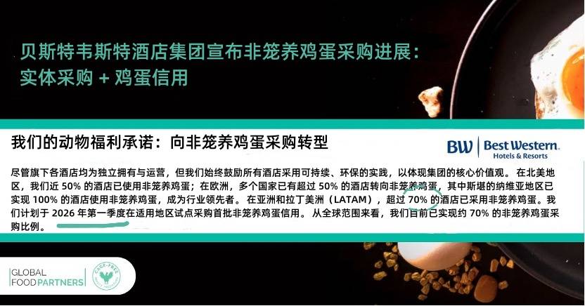 此外,贝斯特韦斯特酒店集团(Best Western)——一家在中国及全球拥有业务的知名酒店品牌——也公布了其在非笼养鸡蛋采购方面的最新进展,并宣布将通过非笼养信用项目进一步推进相关承诺。