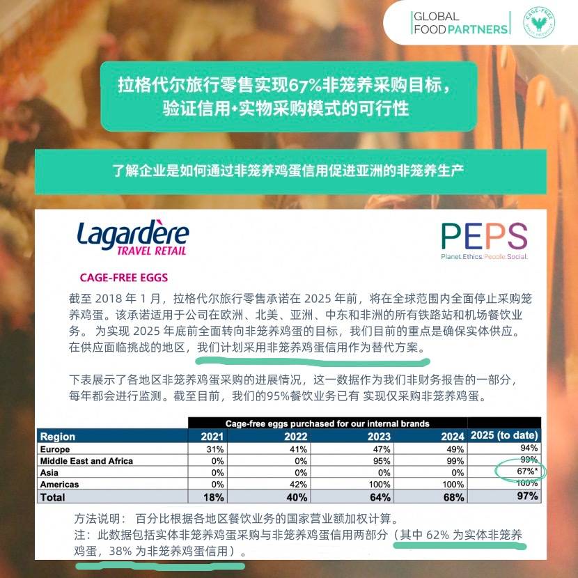 拉格代尔旅行零售(Lagardère Travel Retail) 是全球领先的零售与餐饮运营商,在中国及亚洲多地均设有业务。该公司近日发布消息称,得益于非笼养鸡蛋信用的使用,其在亚洲地区的非笼养鸡蛋使用比例已超过67%。同时,拉格代尔承诺将在年底前,通过信用采购的方式,填补供应链中剩余的非笼养鸡蛋采购缺口。