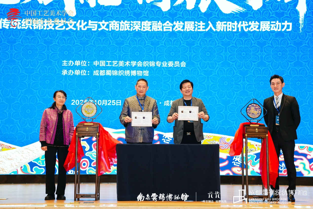发布当天就售出超百件!是什么魅力让藏家市场以实际行动看好这次双锦共鸣的工艺美术品?“《威凤祥麟》让一件作品提供了两种截然不同,但华美的艺术画面,实现一物两看、一物两用的丰富观感,尤其锦中之冠的云锦与万锦之母的蜀锦各自在保留工艺特性下的创新表达,其实更符合现代收藏对于“有底蕴但独特”的追求。”来自南京书画世家的收藏家汪先生表示。麒麟与凤凰是中国古代最高等级的祥瑞图腾,麒麟出没,必有祥瑞;凤凰降临,天下安宁。《威凤祥麟》摆在家中,既是艺术品,更是活的非遗记忆。“签名签到手疼但是很开心,因为看见大家愿意了解并喜欢织锦工艺的艺术品,就是对我推广云锦最大的肯定”,南京云锦博物馆国家级代表性性传承人周双喜在签第100张证书的时候回答到。